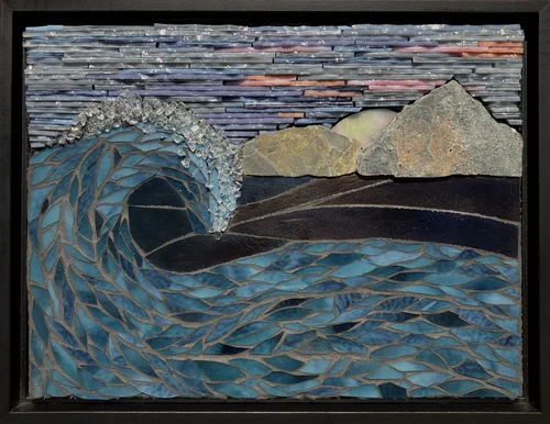 Stained glass, iridescent glass, mirror glass, and glass frit. The foam on the wave was created by multiple layering of clear, coarse glass frit. 24" x 18"