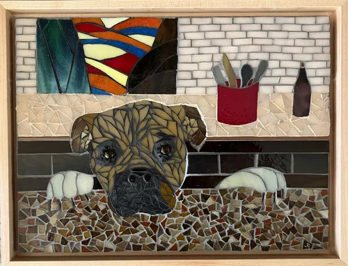 This is a large mosaic I created during early Covid lockdown for my son and his family of five. It was installed outdoors at one end of their swimming pool. Each turtle represents a member of the family. I used thinset mortar to adhere the hand-cut stained & iridescent glass to construction board. The round and slightly raised bubbles and the turtles’ eyes were created in a kiln by fusing clear and iridescent glass together. The mosaic was finished with charcoal-colored grout. It is 3 feet by 5 feet.